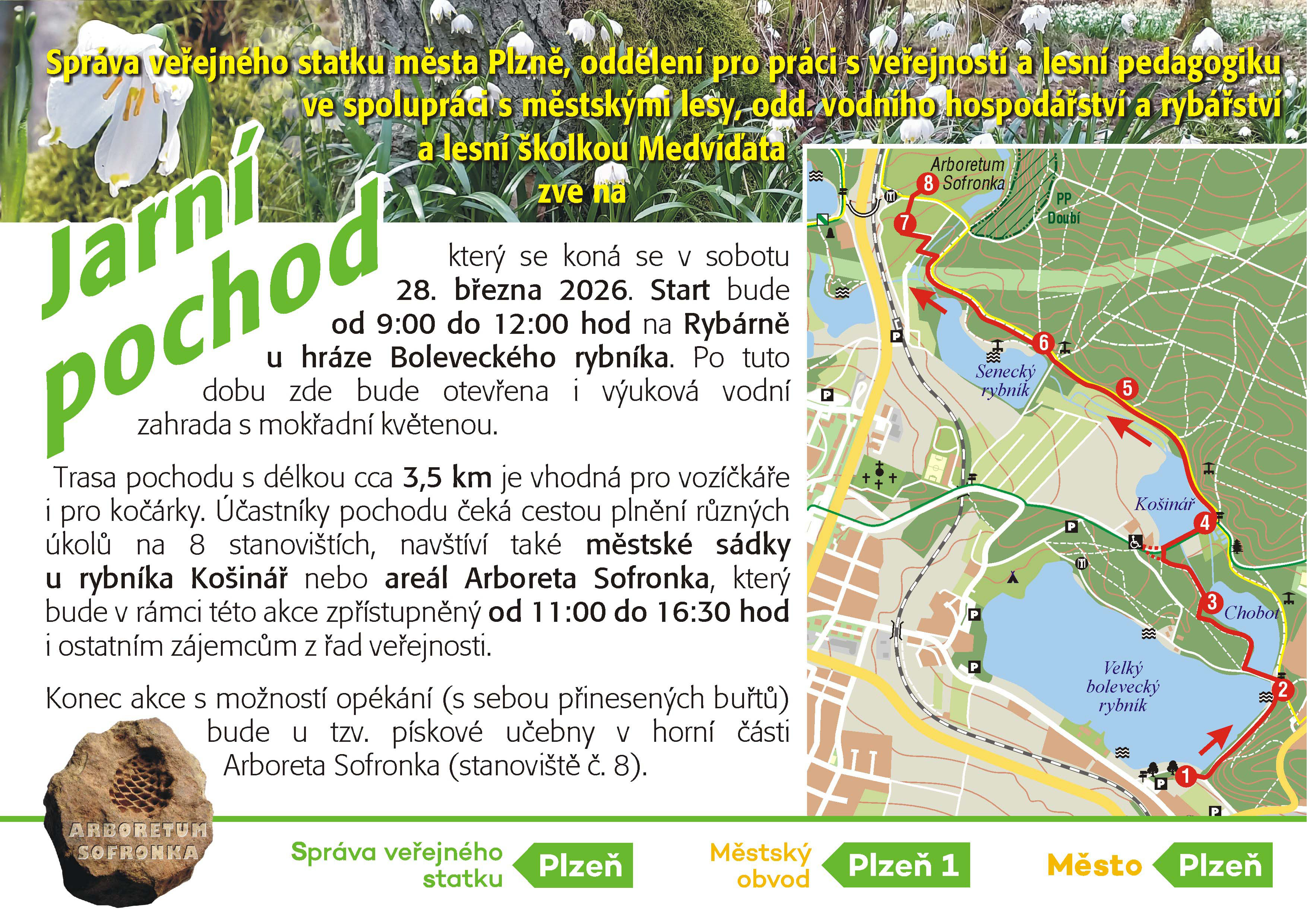 Plzeň chystá na sobotu 28. března tradiční Jarní pochod rekreační oblastí Boleveckých rybníků. Trasa z Rybárny do Arboreta Sofronka je navržená tak, aby ji zvládly rodiny s dětmi i vozíčkáři. Na účastníky čeká osm naučných zastávek, prohlídka živých ryb nebo opékání špekáčků.